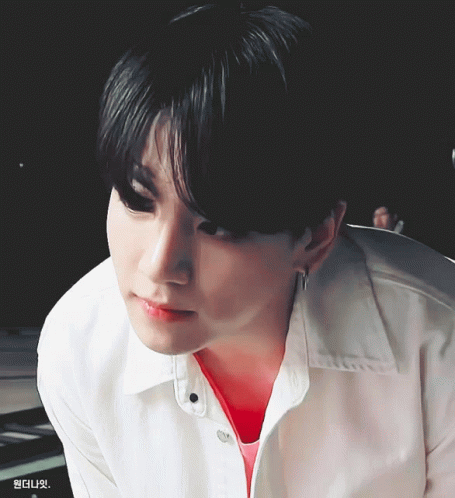BTS member Jungkook, also known as Jeon Jungkook, looks down and then up, wearing a white shirt over red, with a 'Wonder Night' caption.
