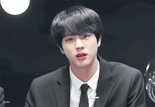 BTS member Jin delivers his signature blow kiss, looking handsome in a suit and tie.