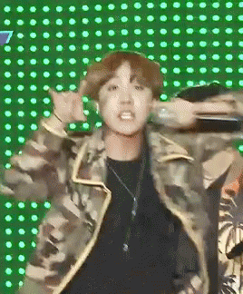 BTS member J-Hope winks and makes a gesture while performing in a camouflage jacket.