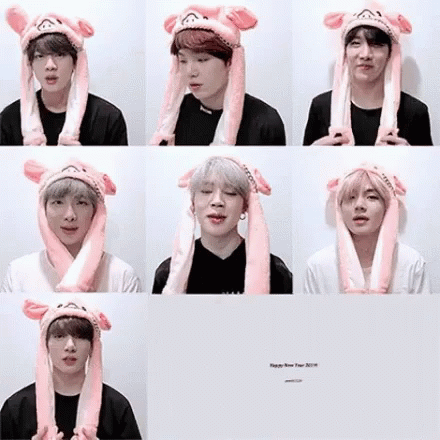 BTS members celebrate Happy New Year 2019, wearing adorable pink pig hats and making cute gestures.