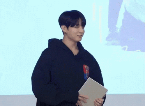 Jungkook from BTS makes a charming finger heart gesture, smiling while holding a tablet.
