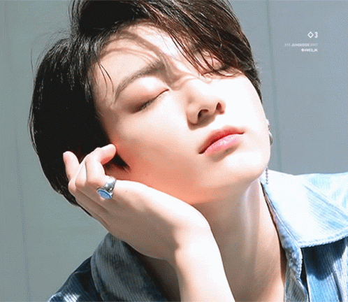 A close-up portrait of BTS member Jeon Jungkook, with a distinctive ring on his finger.