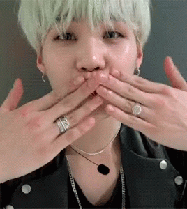 BTS member Suga (Min Yoongi) with light hair, wearing a black jacket and necklace, looking at the camera.