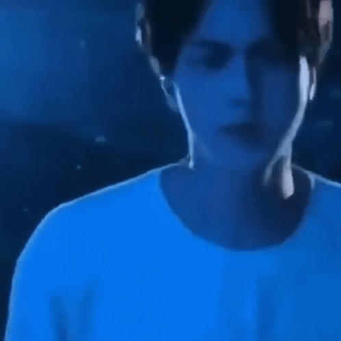 BTS member Jin (Seokjin) with his tongue out, illuminated by blue light, as seen in Soopyoon content.