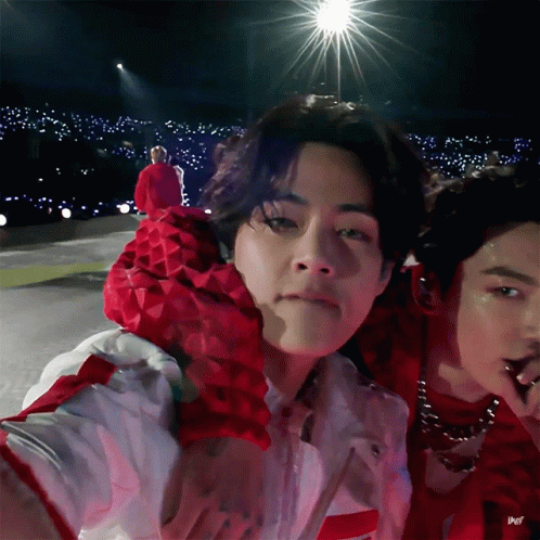 BTS members V and JK performing live on stage, interacting with the crowd during their 'Dope' performance.