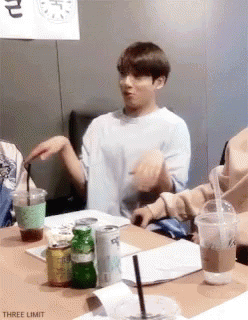 BTS members Jungkook and RM show funny, animated reactions while sitting at a table with drinks.