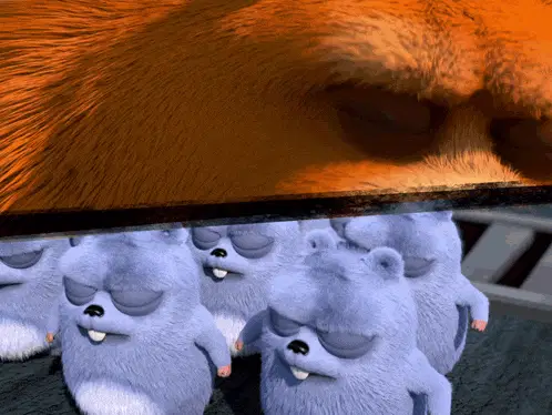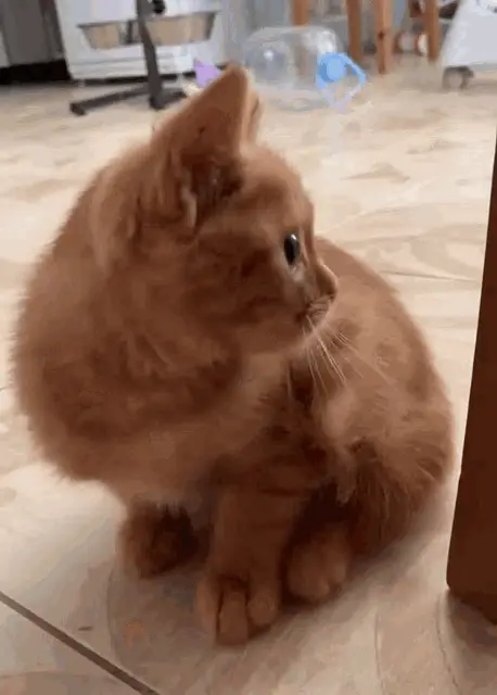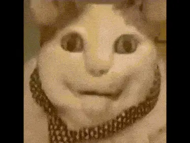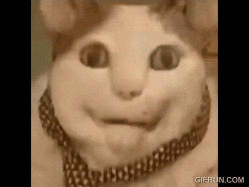 Close-up of Бу, the cat with human-like features, reacting with a frightened or surprised expression.