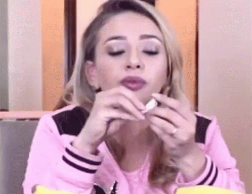 Junia Gabriela enjoys eating bubblegum chiclets, closing her eyes in delight while wearing a pink jacket.