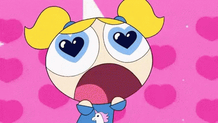 Bubbles from The Powerpuff Girls with heart-shaped eyes and a shocked expression, wearing a unicorn top.