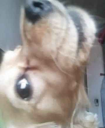 Bubu the dog looks up with wide, curious eyes in a close-up shot.