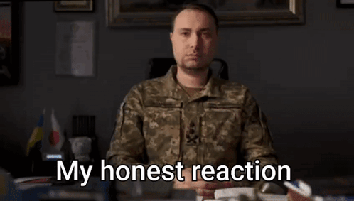 Kyrylo Budanov, in military uniform, sits at a desk with a serious expression for the 'My honest reaction' meme.