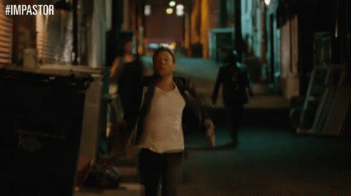 A man, possibly Buddy, runs through a dark alley, from the show Impastor.