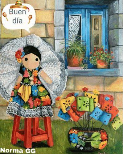 Norma GG's vibrant painting features a traditional Mexican doll and 'Buen día' greeting.