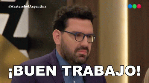 Damián Betular, judge on Masterchef Argentina, says '¡Buen Trabajo!' while wearing glasses and a blue suit.