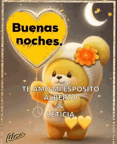 A cute teddy bear sends a 'Good night' message with a heart balloon, expressing love to Alberto and Leticia.