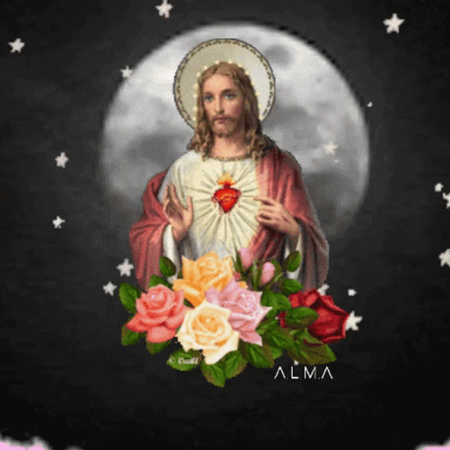 Jesus image with flowers, moon, and stars, wishing good night blessings.