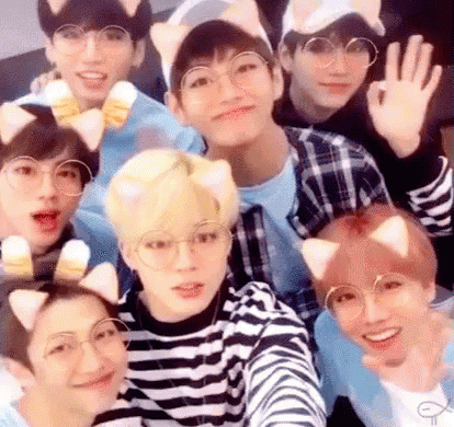 BTS members greet fans with 'Buenas Tardes!' while wearing cute cat ear filters and glasses, making playful expressions.