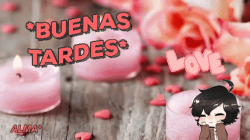 A warm 'Buenas Tardes' greeting featuring flickering pink candles, scattered hearts, and a cute anime character, conveying love.