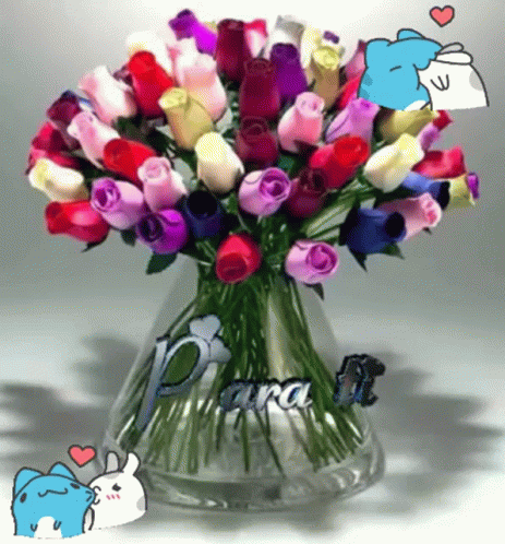 Animated 'Buenas Tardes' message with a vibrant bouquet of colorful wooden roses in a glass vase, featuring cute stickers.