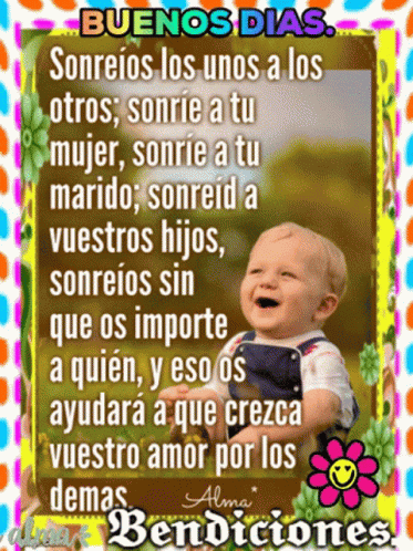A heartwarming good morning message encouraging smiles and love, featuring a cheerful baby. Alma Bendiciones.