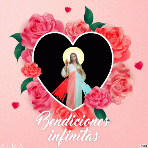 Jesus Christ in a heart of roses, wishing infinite blessings and a good morning.
