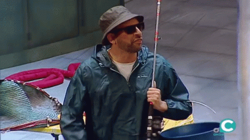Morera delivers an annoyed greeting with a fishing rod during Carnaval De Cádiz, wearing a hat and sunglasses.