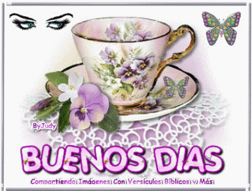 Animated 'Buenos Dias' greeting with a floral teacup, butterflies, and sparkling effects.