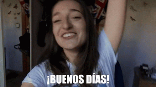 Irene Rain happily greets the camera with '¡Buenos Días!' and a big smile.