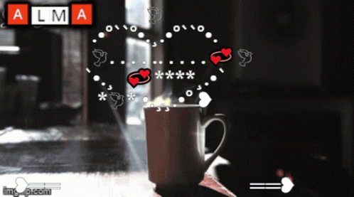 A steaming coffee cup with animated hearts and a positive message to live, smile, and be happy.