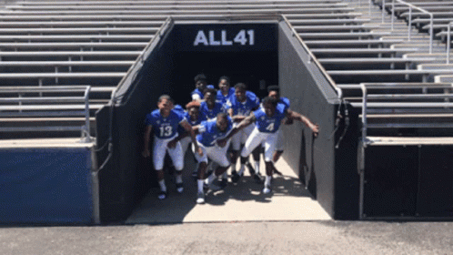 The Buffalo Bulls football team makes an energetic entrance onto the field from a tunnel marked 'ALL41'.