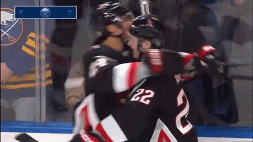 Buffalo Sabres players, including Dylan Cozens, celebrate a goal on the ice.