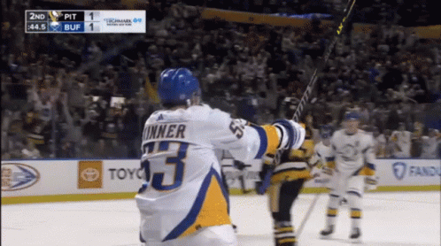 Jeff Skinner, wearing number 53 for the Buffalo Sabres, celebrates scoring a goal during an NHL hockey game.