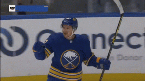 Jeff Skinner celebrates after scoring a goal for the Buffalo Sabres in a hockey game.