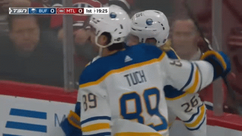Buffalo Sabres players, including Rasmus Dahlin, celebrate a goal against Montreal, with Tuch, Samuelsson, and Skinner visible.