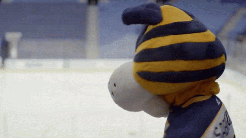 Buffalo Sabres mascot Sabretooth turns its head on the ice rink, looking around.