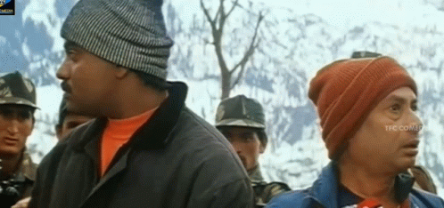 Bugga Prasadu and Sunil appear confused amidst a group of men in winter gear, set against a snowy mountain backdrop.
