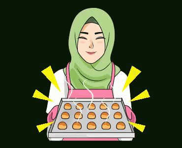 Cartoon woman in hijab smiles, holding a tray of freshly baked cookies, ready for Buka Puasa.