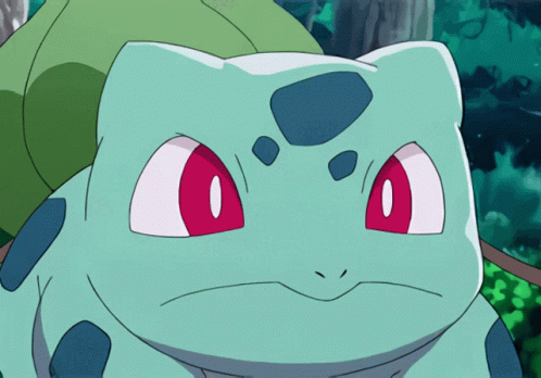 Bulbasaur smiles happily with rosy cheeks, showing its excitement.