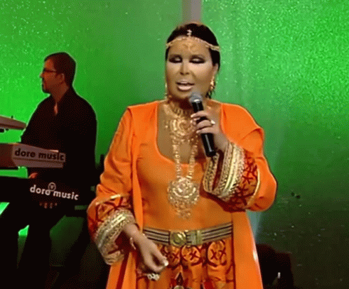 Bülent Ersoy performing live, singing into a microphone on stage.