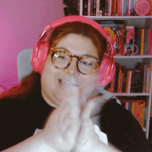 a woman wearing pink headphones and glasses stands in front of a bookshelf