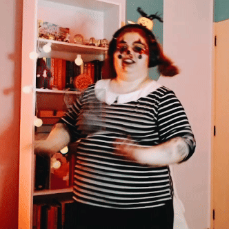 Bulhufasdanath dança animadamente em fantasia de palhaço para o Halloween, com maquiagem e camisa listrada.