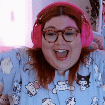 a woman wearing pink headphones and a hello kitty shirt is smiling
