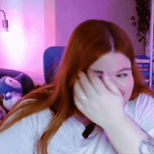a woman covering her mouth with her hand in front of a purple light
