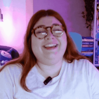 a woman wearing glasses is smiling in front of a purple wall