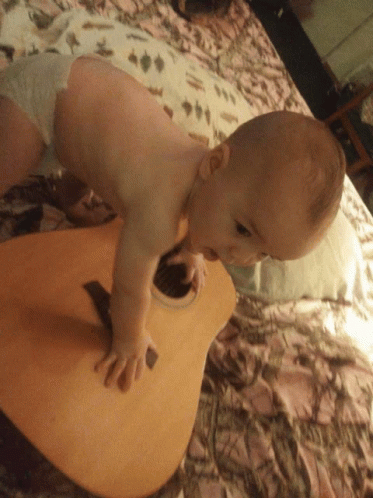 Bumba Baby crawls and plays with an acoustic guitar on a bed, exploring the instrument with curiosity.