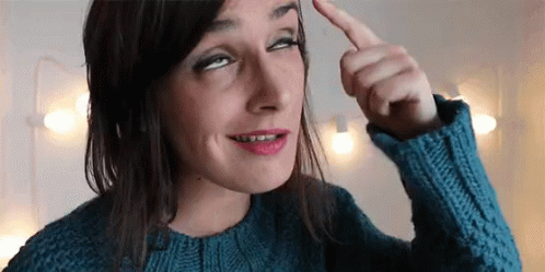 Bumba Na Fofinha makes a funny face, pointing to her forehead in a playful, smart gesture.