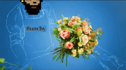 A pixelated Cryptopunk figure, wearing an apron with 'Bunchy' written on it, holds a vibrant flower bouquet.