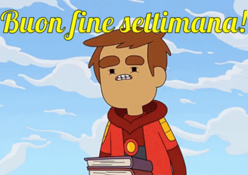 A cartoon character looking stressed while holding books, with the message 'Good weekend!' for relaxation.