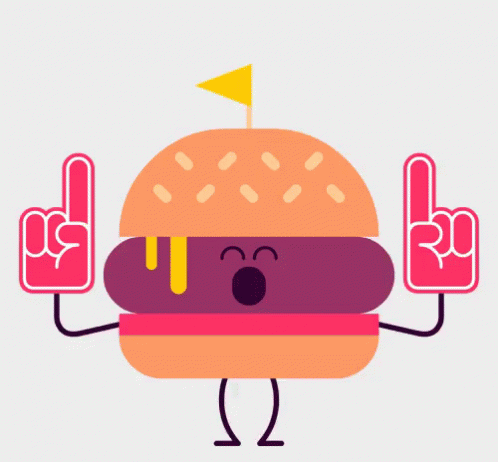 A happy cartoon burger mascot with foam fingers and a flag, cheering enthusiastically.