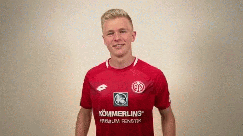 Mainz 05 player Burkardt flexes his muscles, proudly wearing his red Kömmerling Premium Fenster jersey.